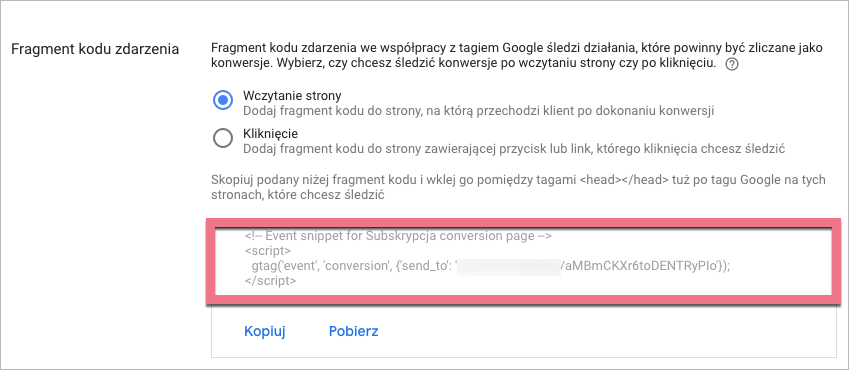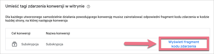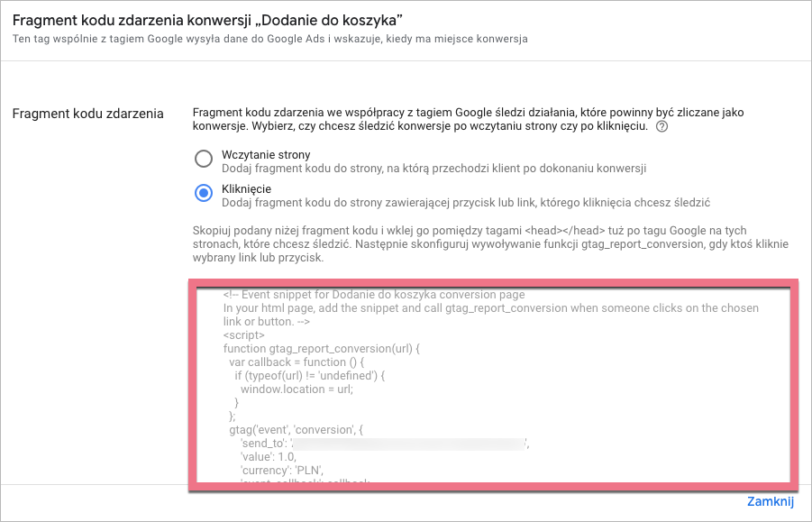 1. Wróć do Google Ads, przewiń w dół, aby wyświetlić kod zdarzenia.