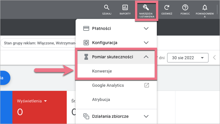 2. W prawym górnym rogu kliknij ikonę Narzędzi i Ustawień. Przejdź do Konwersji w sekcji Pomiar skuteczności.