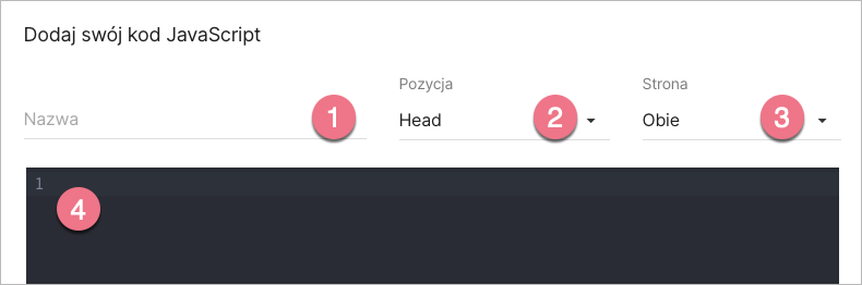 4. Wpisz nazwę (1) i wybierz pozycję Head (2) na Obu (3) stronach. Wklej kod w polu Treść (4). Kliknij Dodaj kod.
