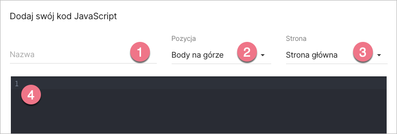 4. Wpisz nazwę (1) i wybierz pozycję Body na górze (2) na Stronie głównej (3). Wklej kod w polu Treść (4). Kliknij Dodaj kod.