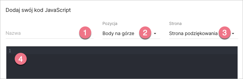 4. Wpisz nazwę (1) i wybierz pozycję Body na górze (2) na Stronie podziękowania (3). Wklej kod w polu Treść (4). Kliknij Dodaj kod.