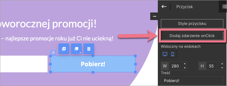 7. Kliknij Dodaj zdarzenie onClick w panelu po prawej stronie.