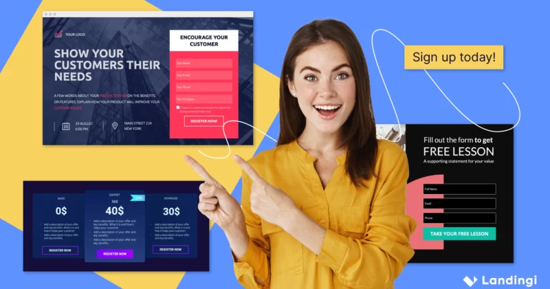 Czas na listę 10 najlepszych przykładów landing page’y typu sign-up w 2023 roku. Jeśli znajdziesz wśród nich coś, co idealnie pasuje do swojej firmy, pamiętaj, że możesz łatwo zbudować bardzo podobne strony za pomocą Landingi. Szybki rzut oka na dwa losowe szablony sign-up landing page’y dostępne w platformie: