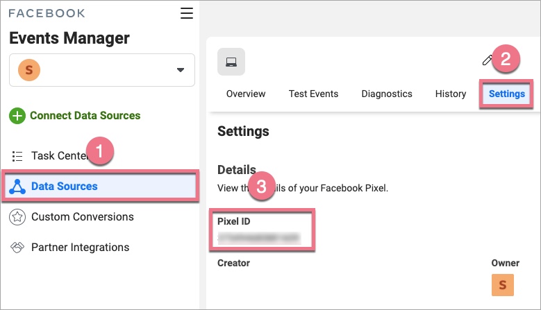 3. To find your pixel ID, go to Data Sources (1) > Settings (2), and copy the ID (3).