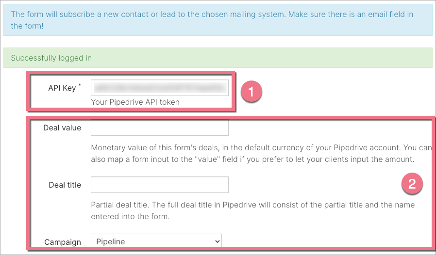 4. In the API Key field (1), paste the API token from Pipedrive. Fill out the remaining fields (2).