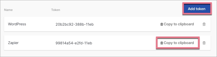 5. Create new API token. Click on the Add token button, name it, and confirm by clicking on Create new token. Your new token will appear on the list.