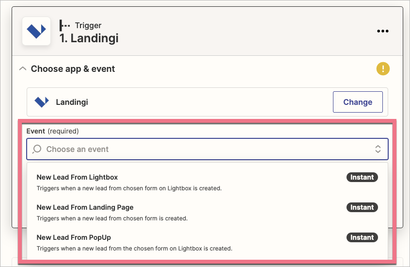 When your Landingi account is integrated with Zapier, you can create a zap.