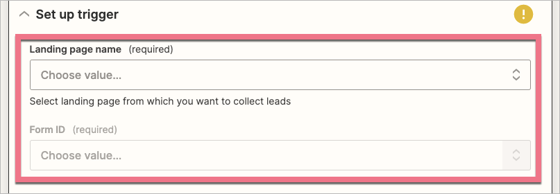 If you run an A/B/x test and want to send leads to Zapier from all landing page variants, you need to create a distinct Zap for each variant. This is because Zapier creates a Zap using the landing page name and form ID, and the variant created for A/B testing is not recognized as a separate landing page, so it is not included in the list of pages.