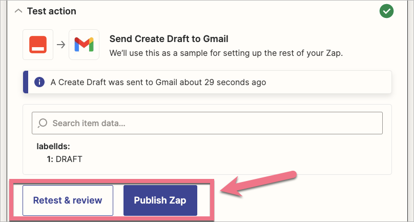 In the Test action section, click on Test & Review or Test & Continue. When the test is successful, you can publish the Zap.